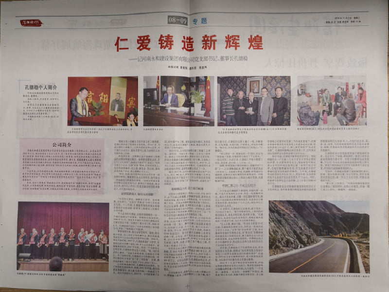 2018年11月7日,《信陽晚報(bào)》刊發(fā)了對(duì)河南永和建設(shè)集團(tuán)有限公司黨支部書記、董事長孔德穩(wěn)的相關(guān)專訪內(nèi)容,文章對(duì)于孔德穩(wěn)的創(chuàng)業(yè)之路、經(jīng)營之道、踐行企業(yè)社會(huì)責(zé)任之舉以及弘揚(yáng)傳統(tǒng)文化之策進(jìn)行了深刻剖析。